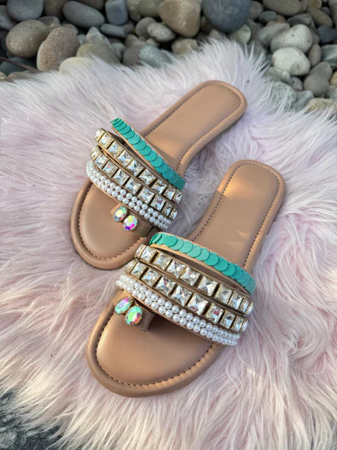 Boho Beaded Multistrap Sandals – Pastel Blue