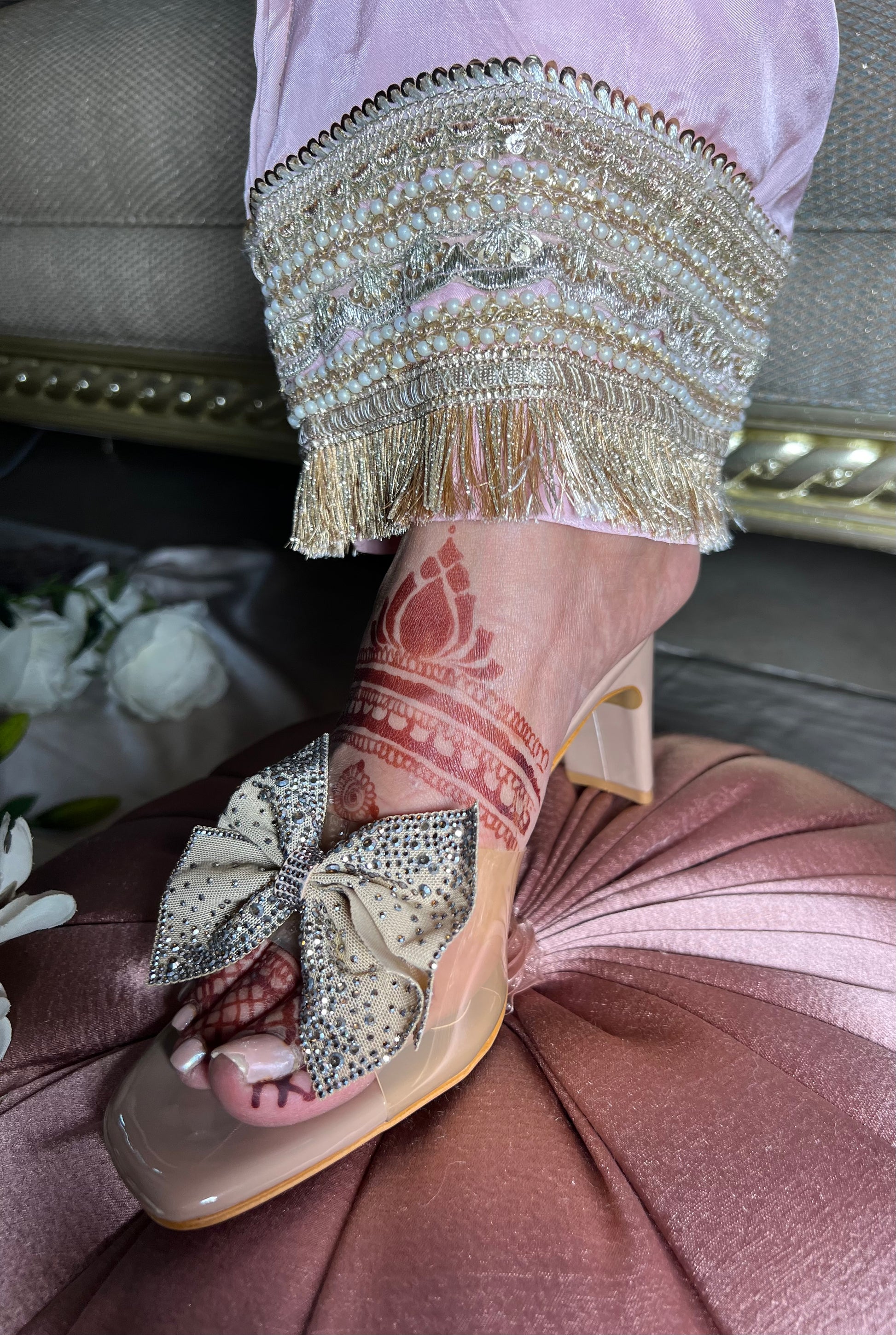 Step into elegance with our Blush Bow Embellished Block Heels. Designed to steal the spotlight, these heels feature a stunning oversized bow adorned with delicate rhinestones that add the perfect hint of sparkle. The soft blush tone pairs beautifully with both ethnic and western outfits, making it your go-to choice for festive celebrations, parties, or weddings.