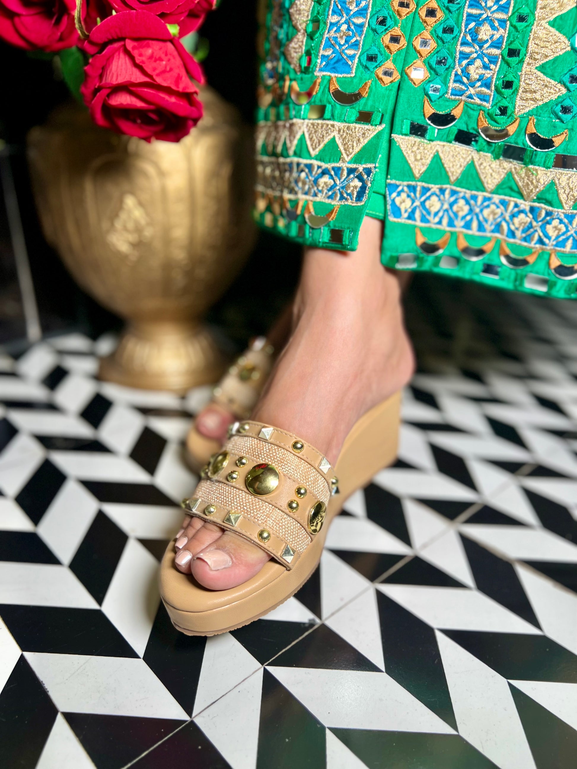 Turn heads this festive season with our Beige Studded Platform Wedges — a perfect blend of comfort and glamour. Designed with intricate beadwork and bold gold studs, these wedges add a chic edge to every ethnic or fusion outfit.