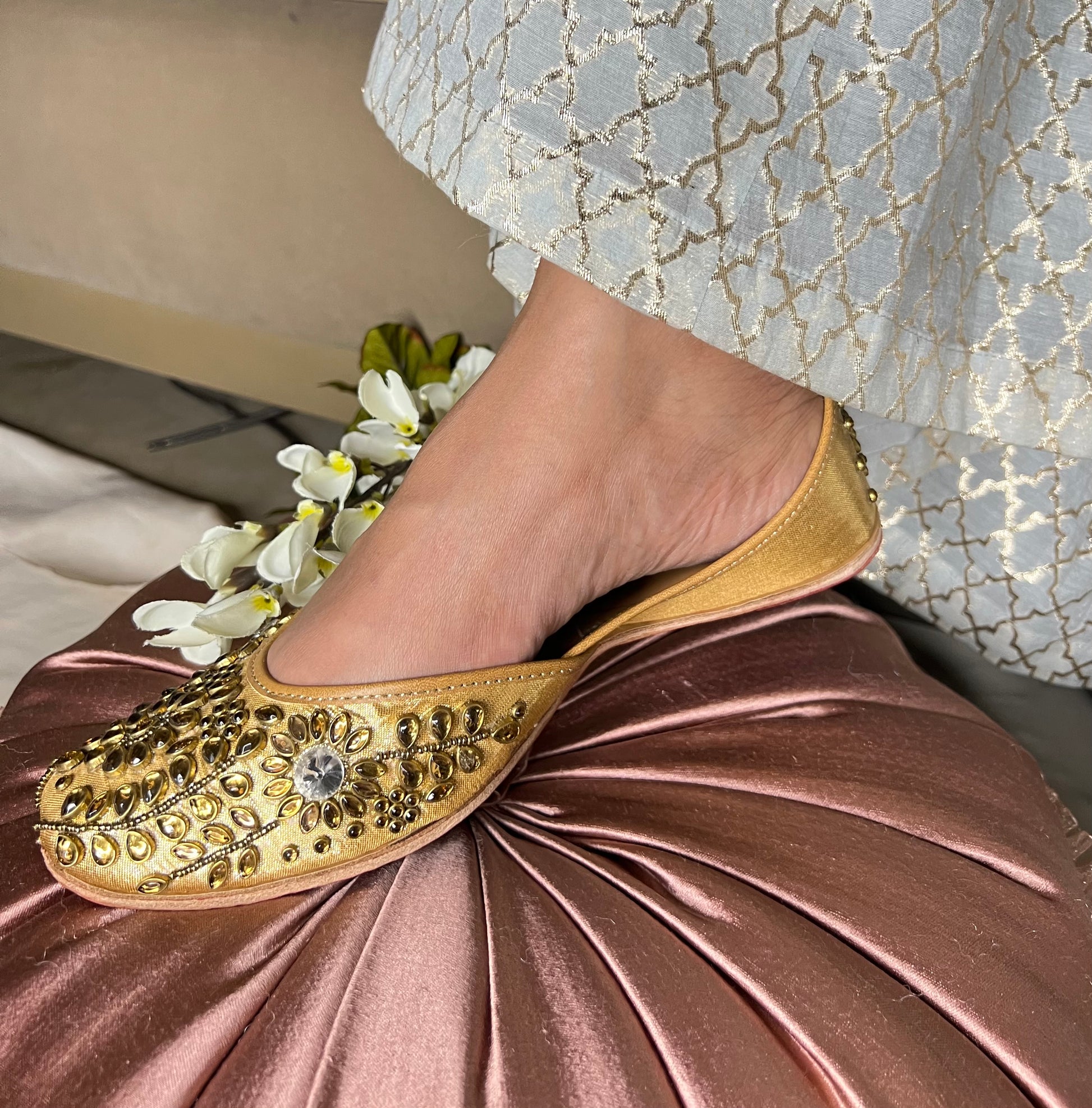 Step into festive elegance with our Golden Glam Kundan-Work Juttis. Crafted in a rich, regal gold hue, this pair is adorned with dazzling hand-embroidered mirror work and intricate bead detailing—perfect for adding instant glamour to any ethnic ensemble.