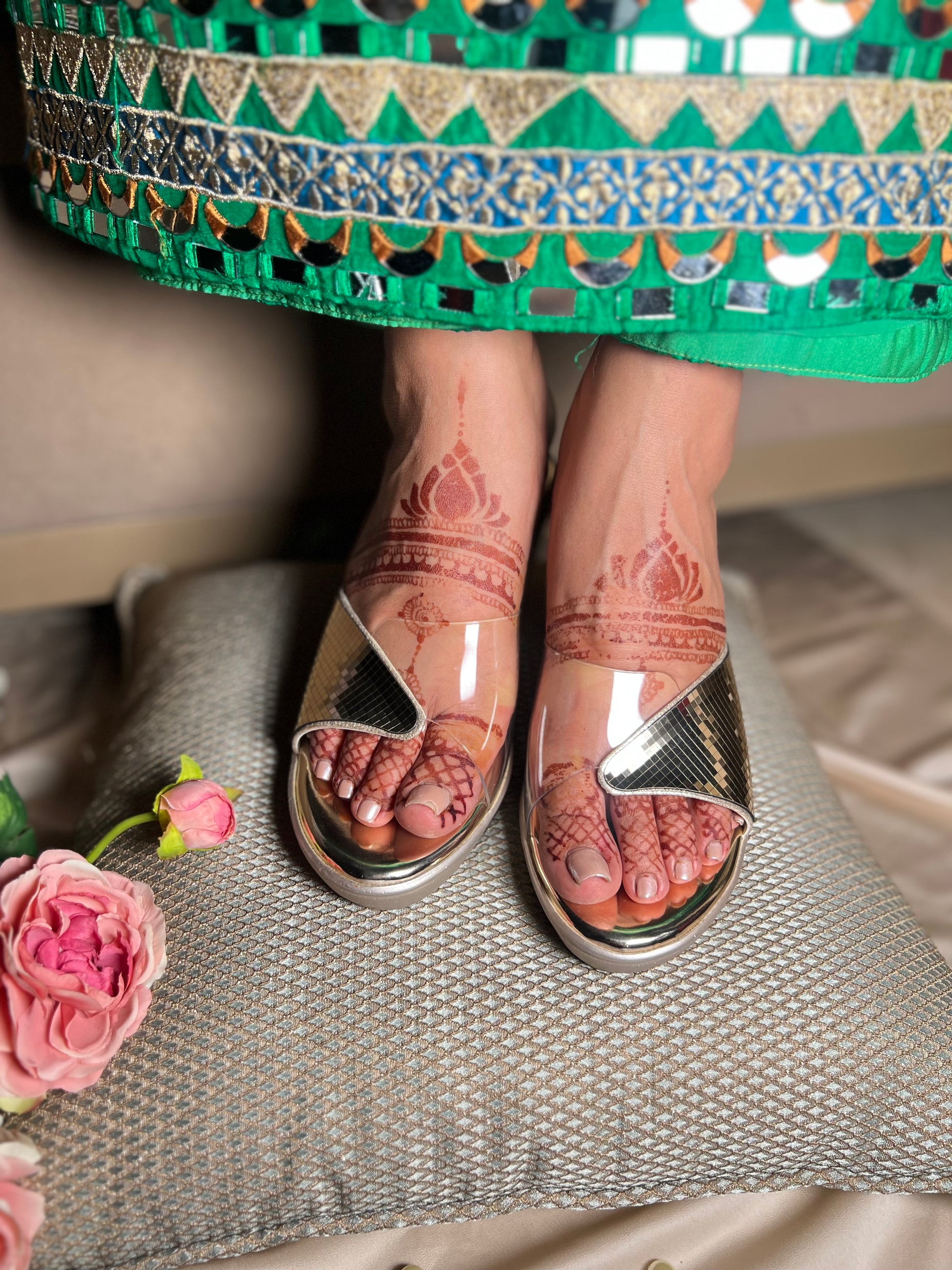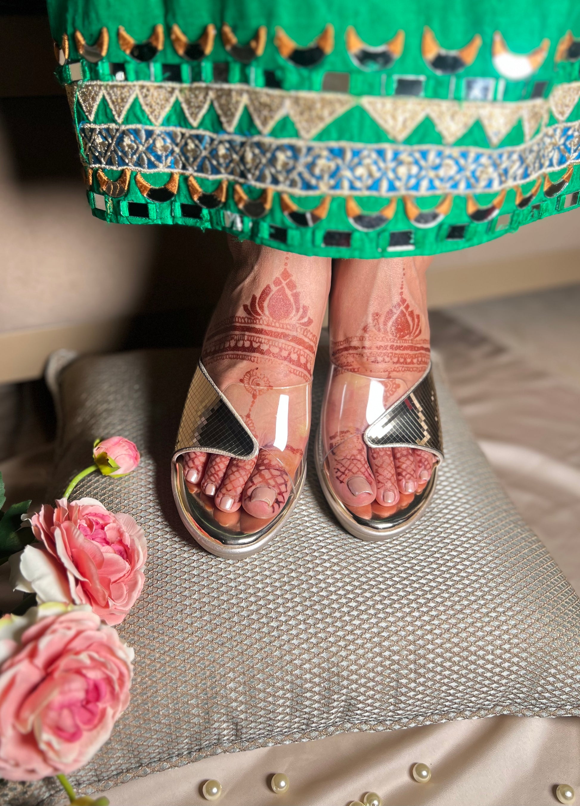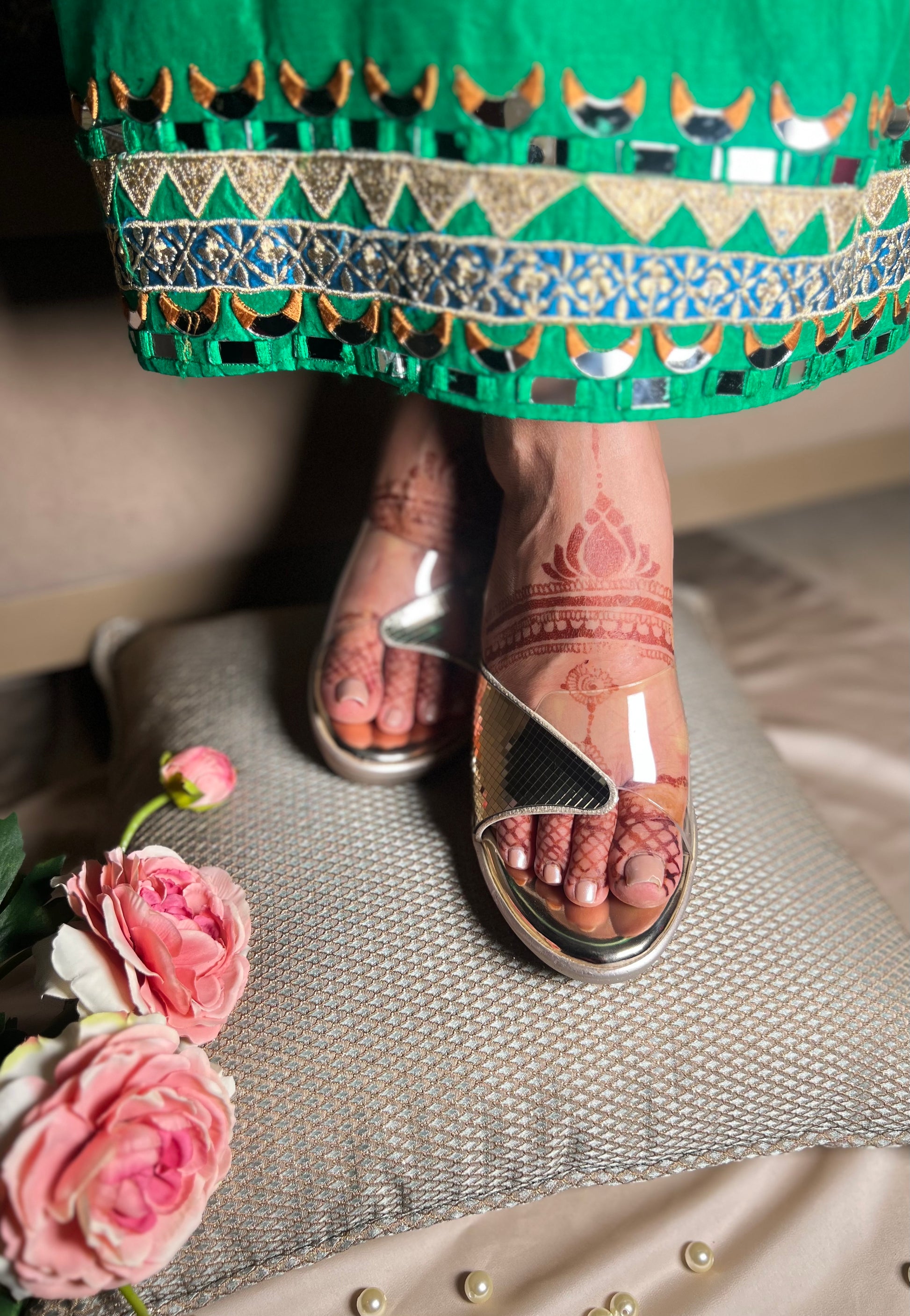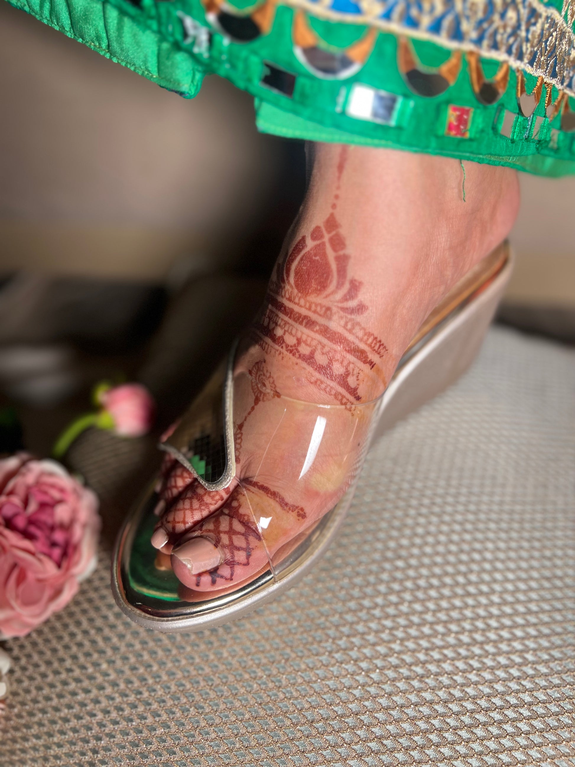 Elevate your ethnic and western looks with the Crystal Clear Glam Wedge Heels! These striking wedges feature a high-shine metallic base complemented by a stylish transparent upper, adding instant elegance and a touch of modern sophistication to any outfit. Designed for ultimate comfort and style, the sturdy wedge heel provides stable support for all-day festivities, while the versatile design seamlessly pairs with sarees, lehengas, or contemporary dresses. Step into effortless chic and let your feet do the talking—perfect for weddings, parties, and festive celebrations alike.