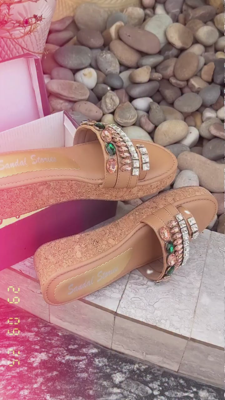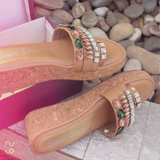 Turn heads with our Emerald & Rose Gold Crystal Embellished Wedges, crafted to bring a touch of luxe sparkle to your wardrobe. Featuring layered straps adorned with striking emerald-green stones and elegant rose-gold crystals, this pair blends glamour with timeless charm.