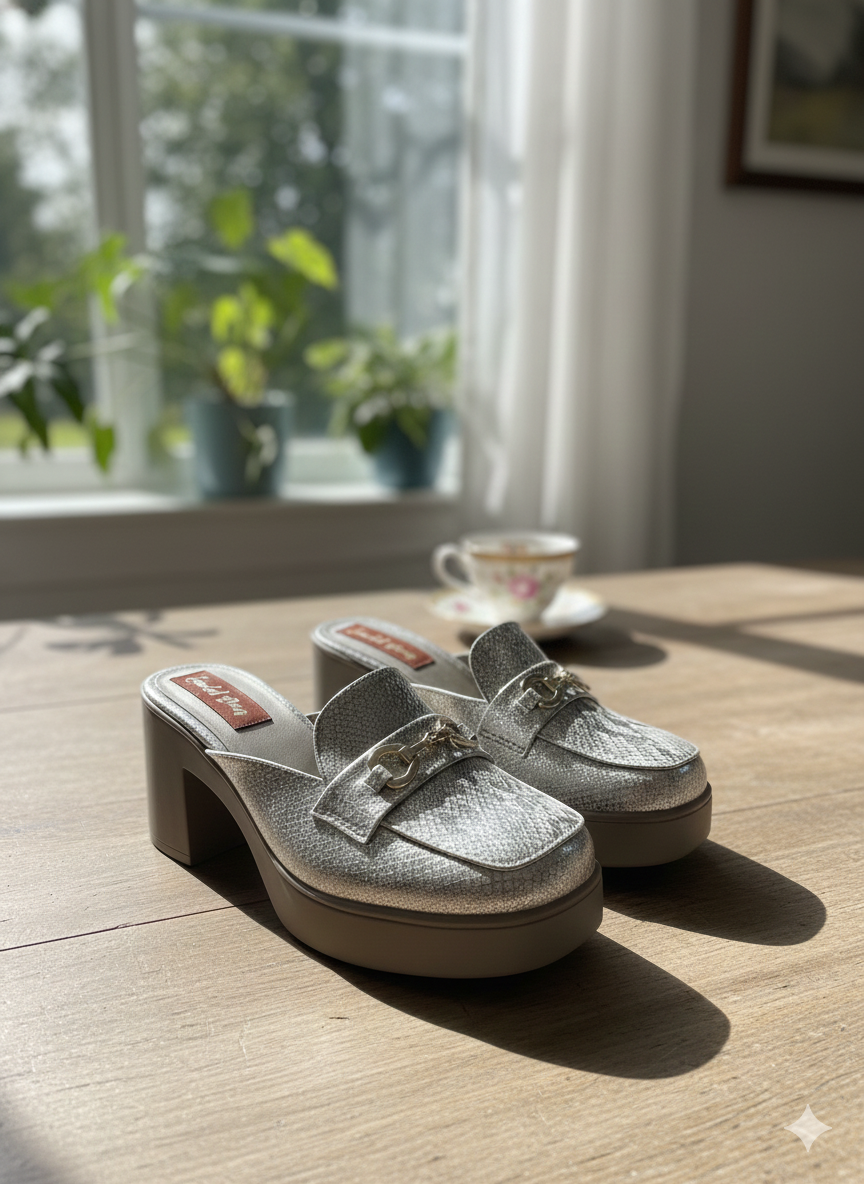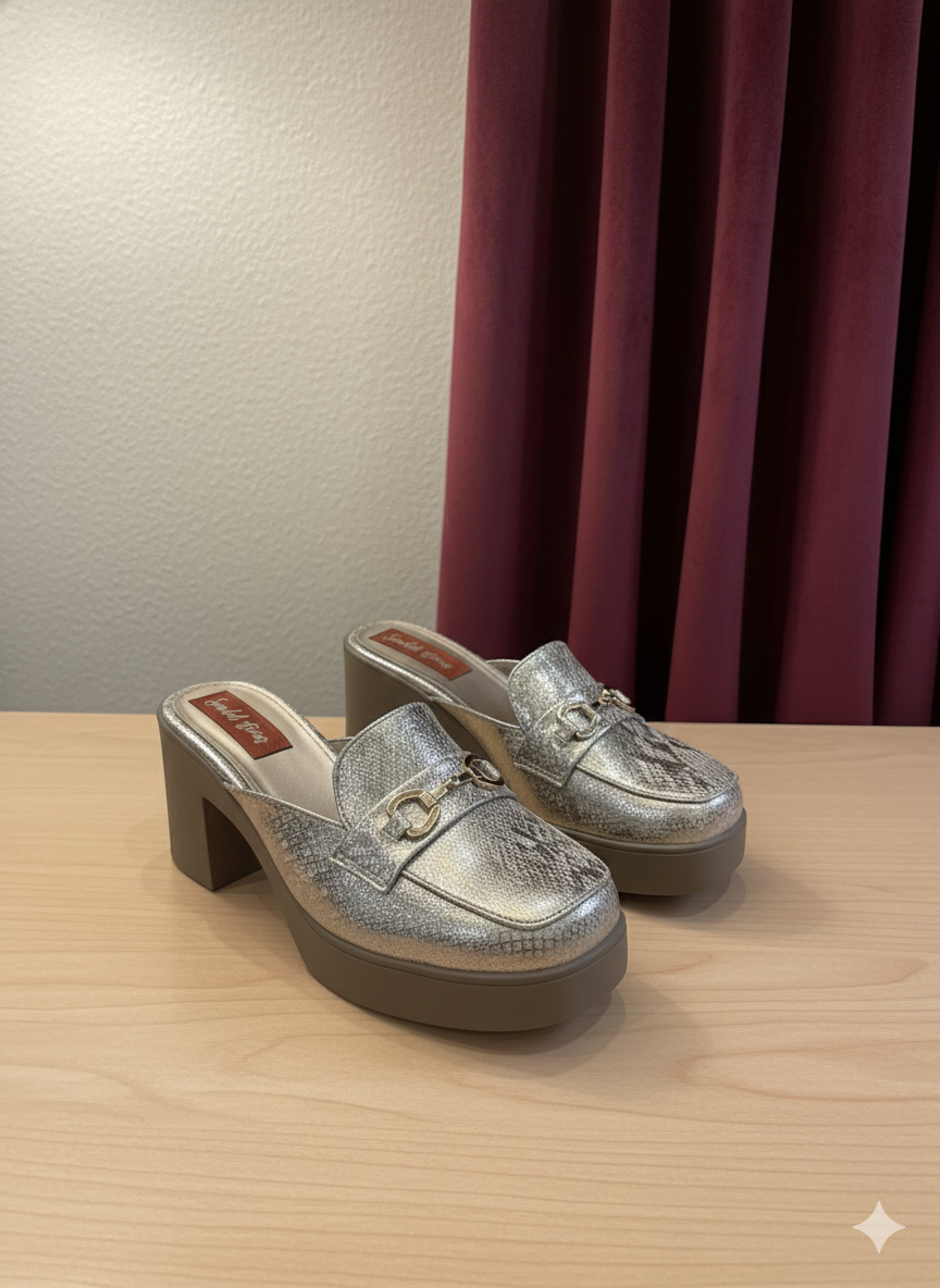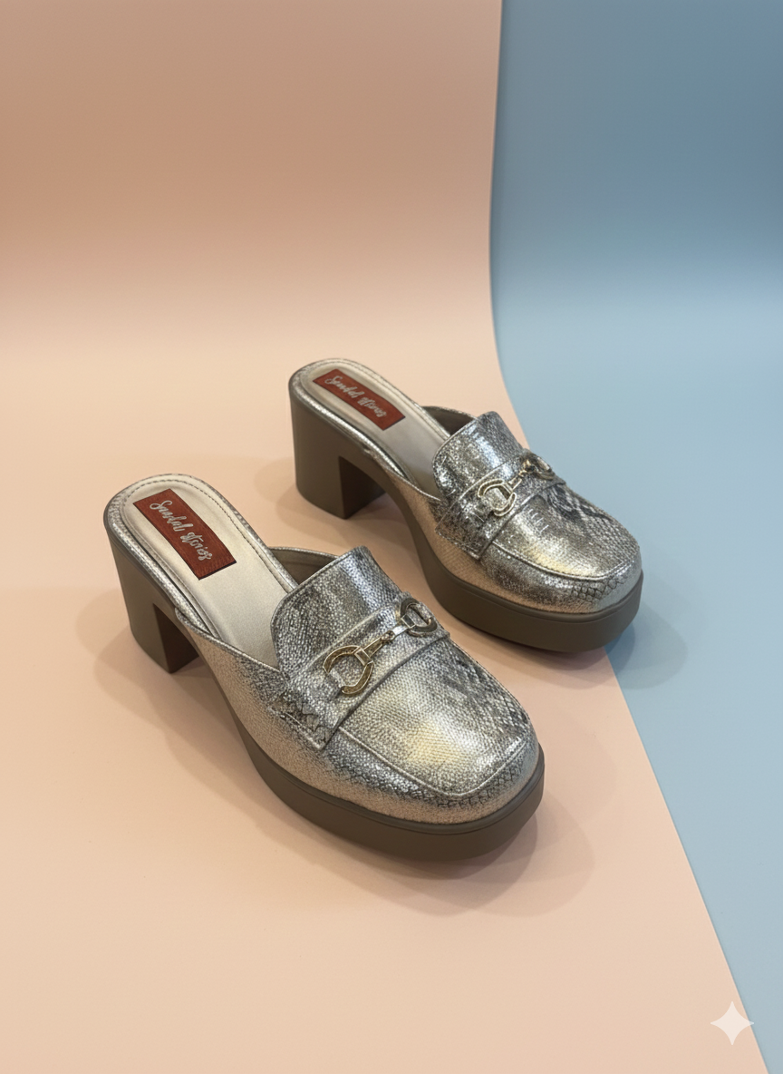Add a touch of luxe shine to your everyday style with our Gold Foil Block Heel Mules. Crafted in a rich foil-textured finish, this statement pair features a classic loafer-inspired upper accented with elegant metal hardware. The elevated block heel paired with a cushioned footbed ensures all-day comfort, while the easy slip-on design makes it effortlessly chic. Perfect for workdays, brunches, or evening outings—these mules bring understated glamour to every step.