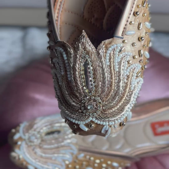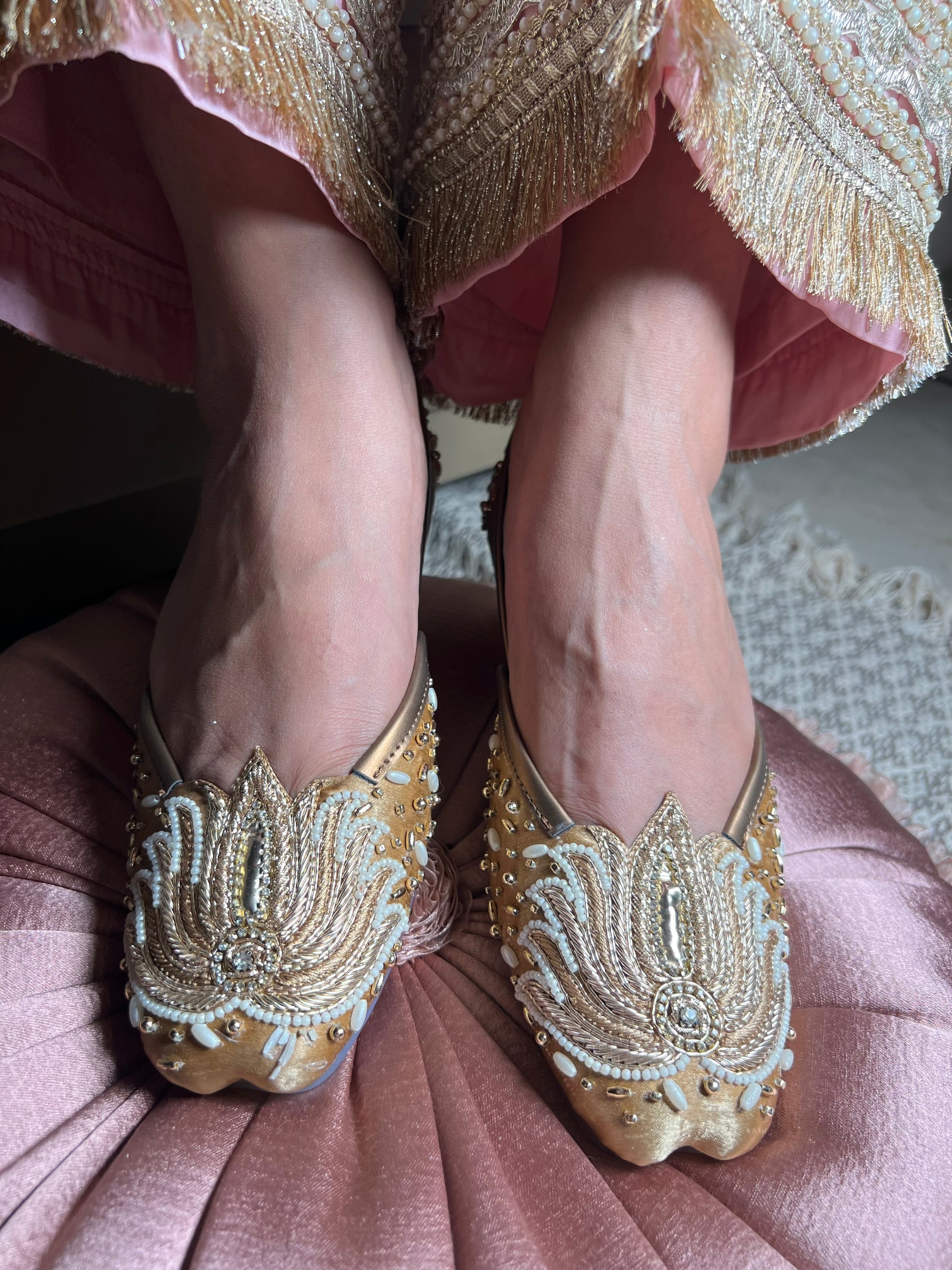 Crafted for the modern muse who loves her roots, this golden Punjabi jutti is a true head-turner. Intricately hand-embroidered with stunning zari and beadwork, it radiates elegance with every step.