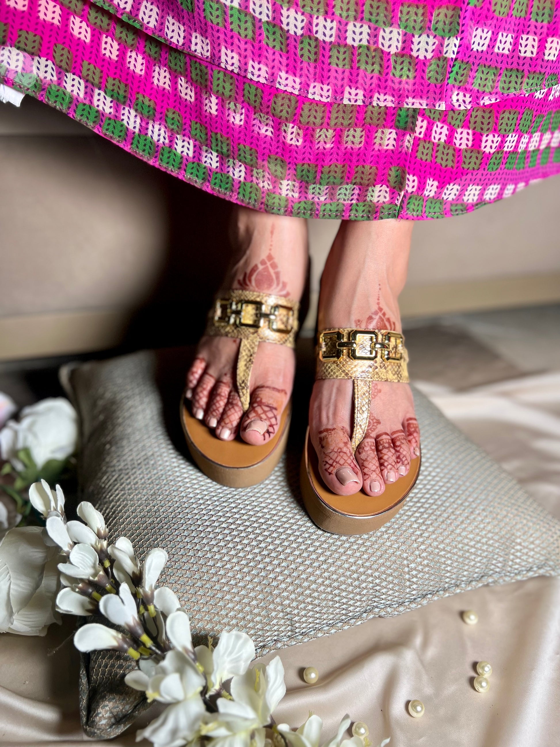 Step into effortless style and comfort with our Luxe Gold Buckle Platform Kolhapuri sandals, designed for women who love to blend tradition with a contemporary twist. Featuring a shimmering golden strap with a statement buckle and exotic snakeskin texture, these platforms offer added height without sacrificing comfort. The broad base provides stability and ease, making them perfect for festive occasions, ethnic celebrations, or a chic pairing with casual wear. The intricate Kolhapuri-inspired design element complements bridal henna or mehendi looks, adding a regal touch to your ensemble. Ideal for festive seasons, parties, and wedding events, these sandals are a must-have for your ethnic footwear collection. Shop this trending style for best-in-class comfort, elegance, and versatile fashion.