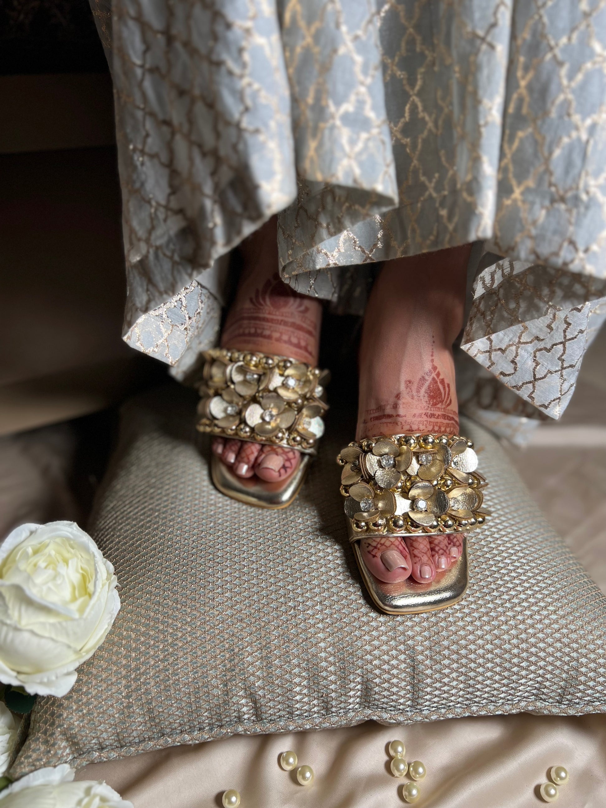 Step into timeless elegance with our Golden Bloom Embellished Block Heels. Designed with a cluster of metallic floral accents and sparkling crystals, these heels instantly elevate any festive or wedding look. The subtle gold tone, paired with a comfortable mid block heel, ensures effortless style and comfort throughout the occasion. Perfectly versatile, they pair beautifully with both ethnic and Indo-western ensembles.