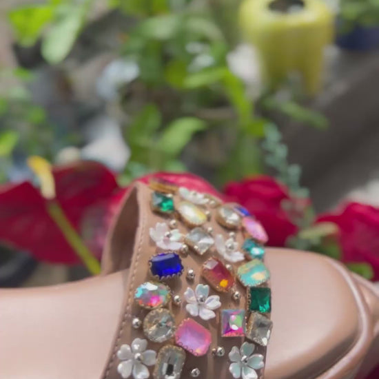 Step into effortless glamour with our Multicolor Jewel-Embellished Nude Wedges. Designed with a comfortable 2-inch heel, these wedges bring together elegance and ease. The broad strap is adorned with vibrant, hand-set gemstones and delicate floral accents, creating a dazzling statement for any outfit. Perfect for weddings, parties, or festive celebrations, these wedges combine style, comfort, and versatility—making them your go-to pair for every special occasion.