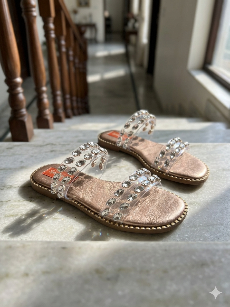 Elevate your footwear collection with the Royal Crystal Double-Strap Flats, a perfect blend of regal elegance and modern comfort. These sandals feature dual transparent bands meticulously encrusted with shimmering crystals, designed to catch the light from every angle. Whether you’re attending a festive celebration or looking to add a touch of glamour to a casual evening, these flats offer a sophisticated silhouette that pairs effortlessly with both ethnic and contemporary attire.