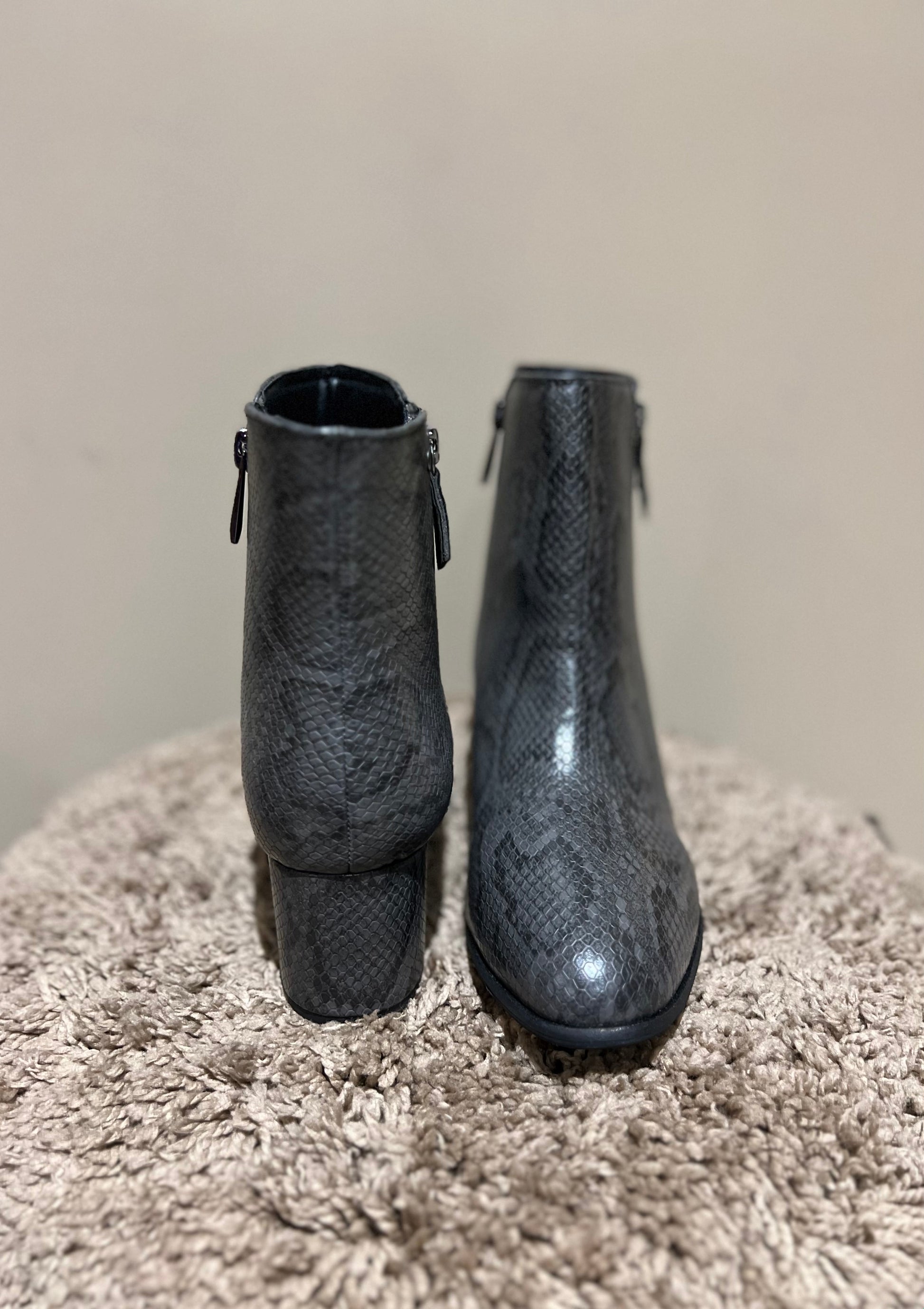 Step into sleek sophistication with these grey snake-effect ankle boots, crafted in a smooth faux-leather finish with an all-over reptile texture. The mid-block heel and almond toe give a polished silhouette, while the side zipper ensures easy on-off and a snug, secure fit. Perfect with skinny jeans, dresses or workwear, these boots add an edgy yet versatile statement to your everyday style.