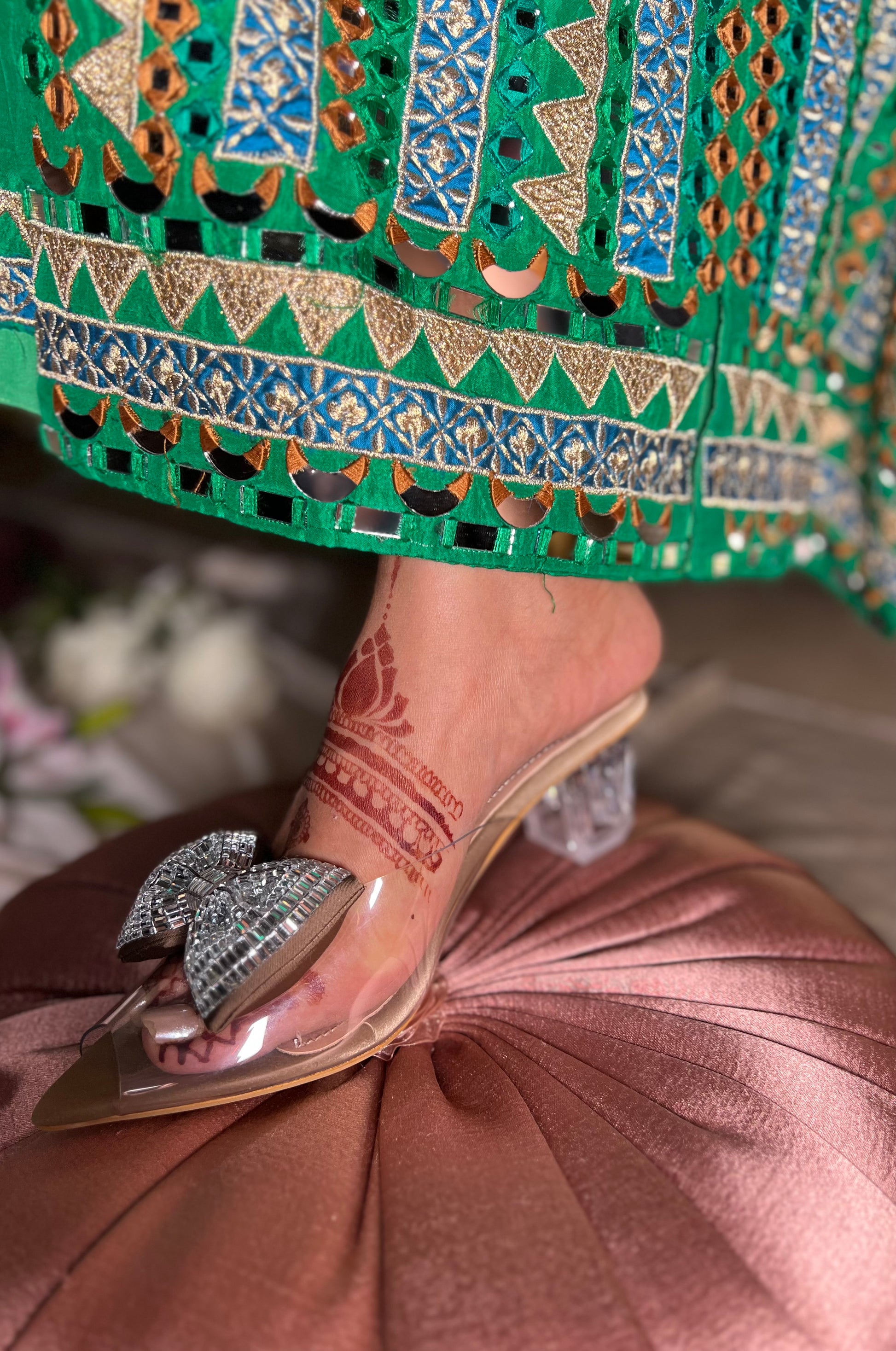 Step into the spotlight with these Crystal Glam Bow Transparent Heels, a stunning fusion of modern chic and festive elegance. Featuring a see-through upper adorned with a sparkling crystal bow accent, these heels provide a graceful edge to any festive or party look. The cushioned sole and block heel offer comfort for all-day wear, making them the perfect companion for celebrations, weddings, or special occasions.